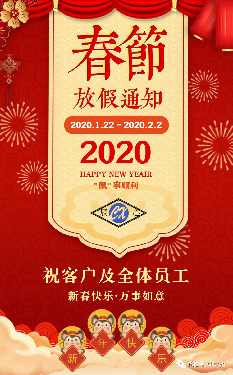 自2020年1月22日至2020年2月2日為我公司春節放假期,屆時將停止發貨, 所有訂單都將在春節假期回來的第一天(2月3日)按訂單順序陸續發出給 您帶來的不便,敬請諒解!